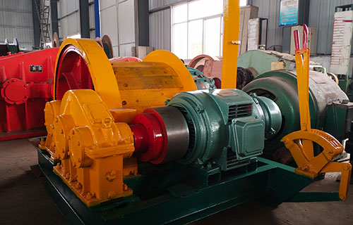 該提升絞車的主軸裝置有固定卷筒、活動卷筒(僅雙筒用)主軸、兩個軸承座、調繩機構(僅雙筒用)等部分組成,用來纏繞或釋放鋼絲繩。單筒提升絞車鋼絲繩為上出繩,雙筒提升絞車活動卷筒為下出繩,固定卷筒為上出繩,卷筒上裝有襯木。