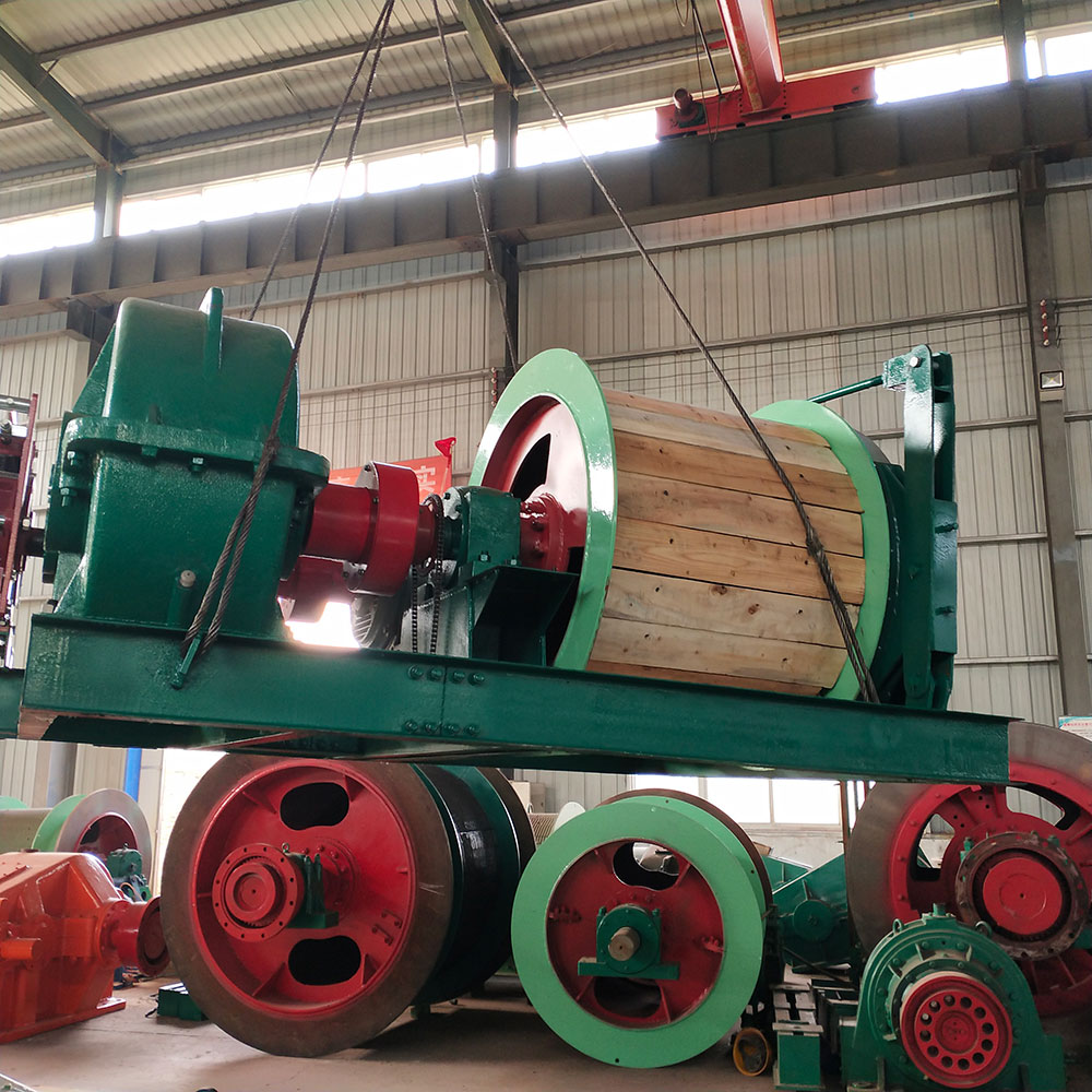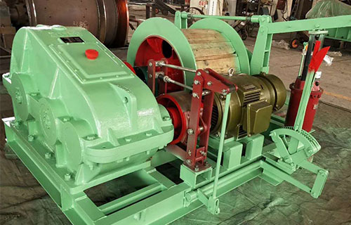 該提升絞車的主軸裝置有固定卷筒、活動卷筒(僅雙筒用)主軸、兩個軸承座、調繩機構(僅雙筒用)等部分組成,用來纏繞或釋放鋼絲繩。單筒提升絞車鋼絲繩為上出繩,雙筒提升絞車活動卷筒為下出繩,固定卷筒為上出繩,卷筒上裝有襯木。